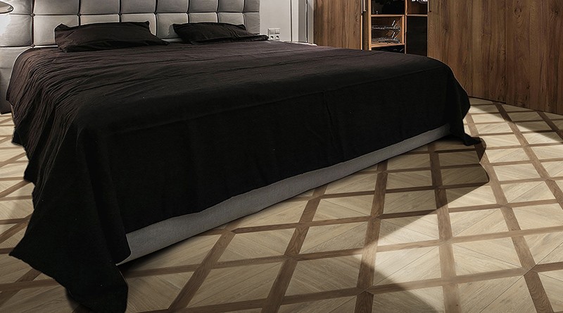 設計理念:?將浪漫主義色彩、藝術線條及空間層次感發揮到了極致,深、淺相間的拼花地板,對比強烈的木質色彩,拼貼效果如棋盤一樣,讓空間頓時充滿著戲劇意味,對于個性、藝術范兒的都市貴族來說可以大膽嘗試。